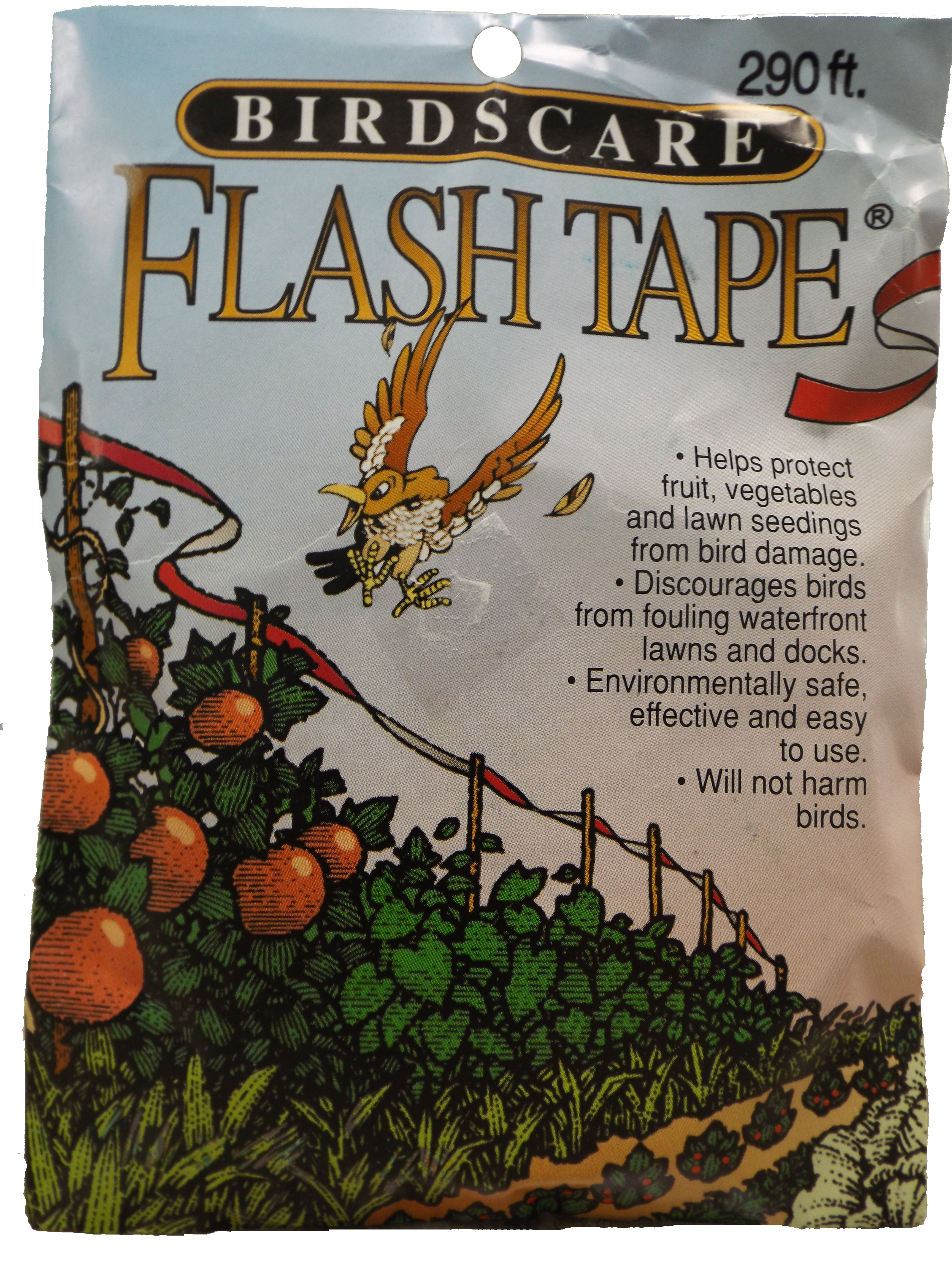 Silver and red metalized polyethylene plastic tape, designed to protect fruits, vegetables and lawn seedlings from birds.