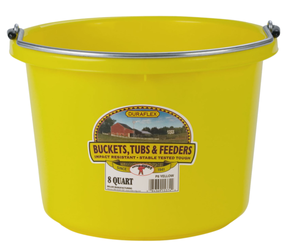 Flat-back plastic bucket with stacking ribs so pails come apart easier when stacked. Polyethylene resin is impact resistant, protects against warpage, and helps prevent stress cracks. Heavy-duty wire bail with notch for hanging. Flat-back design won’t wobble on the wall. Several sizes available.